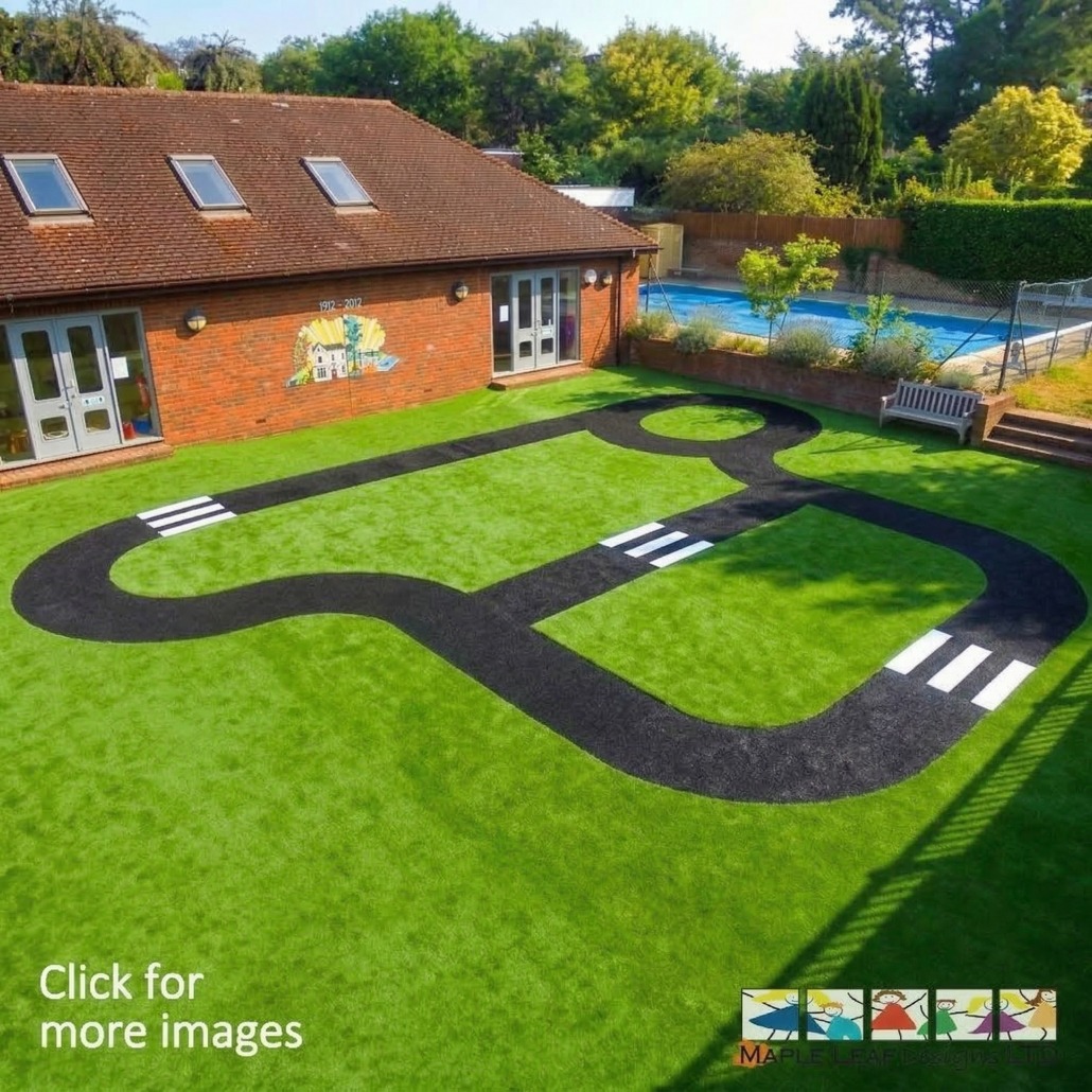 This is a low-maintenance alternative to traditional grass, ensuring year-round greenery and a soft, cushioned surface for children to play on. It is designed to withstand heavy foot traffic, ensuring that it will maintain its vibrant green colour for years to come. With its low maintenance requirements, this artificial grass is a hassle-free option for playgrounds, allowing kids to enjoy their playtime without any worries. Let their imaginations run wild as they race, drive, and navigate their way through a vibrant world of play with our Artificial Grass Trackway.