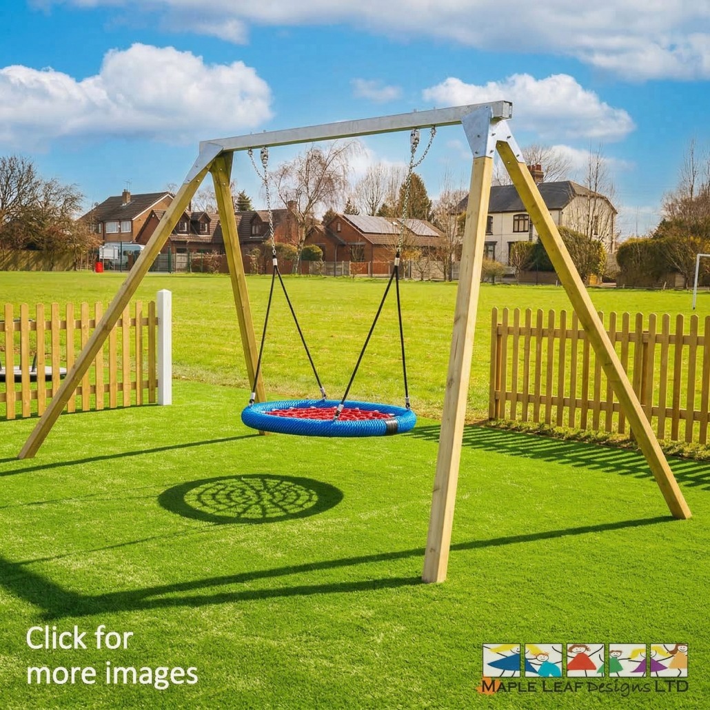 This Birds Nest Swing swing is available with a metal cross bar & timber legs as shown in the main image. The Birds Nest Swing is 1.2m diameter, making it a great piece of playground equipment for group play and children with disabilities.