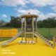 Our Maxi Jungle Play Tower makes use of round timbers instead of square, forming large hexagonal towers for a greater surface area, and surrounded with wooden panelling and polycarbonate windows.. The Maxi Jungle Play Tower features two towers, one with a roof and one without. The towers are fitted with a climbing net, a fireman’s pole, an arch climber, an elevated tunnel and a rotomould slide. As with all of our towers the fittings and orientation can be altered to meet your needs.