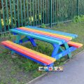 Rainbow Recycled Plastic Picnic Table is 1.5m x 1.m x 0.61m and is manufactured for us from recycled plastic.