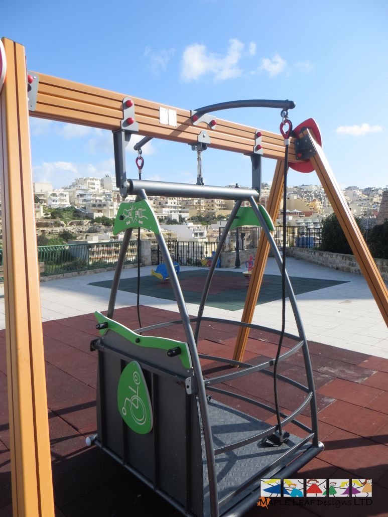 Our Inclusive Wheelchair Swing is suitable for any SEN friendly playground, enabling wheelchair users to safely enjoy swinging motions. The main carriage includes a fold-down ramp for access, and restraints to keep the wheelchair in place. Once inside, the user can rotate the crossbar by pulling on the hanging rope, setting the swing in motion. The same rope can be used to slow and stop the swing, facilitating independent play.